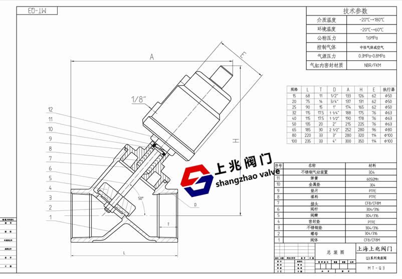![]() 不銹鋼內螺紋氣動角座閥--工作原理: 在非工作狀態(tài)時,由于彈簧力作用,閥門常閉(開)。當執(zhí)行器活塞被壓縮氣體作用時,閥門打開(關閉)。雙作用形式靠壓縮氣體控制閥門開關。 不銹鋼內螺紋氣動角座閥--應用范圍: 啤酒飲料灌裝設備 制藥及醫(yī)療設備 印染紡織 化工行業(yè) 氣體工業(yè) 高溫滅菌 發(fā)泡機械 水/污水處理 不銹鋼內螺紋氣動角座閥--特點: 流量大,流阻小,無水錘 Y型設計,增加30%流量 超長使用壽命 閥桿自動校正,自潤滑,免維護 氣缸采用不銹鋼材質,在惡劣環(huán)境中更加優(yōu)秀,可360°旋轉。 不銹鋼內螺紋氣動角座閥--技術參數(shù): 管道壓力:Max1.6Mpa(232psi) 控制壓力:0.3-0.8Mpa(43.5-116psi) 控制介質:中性氣體或空氣 閥體材料:CF8M/CF8(SS316,SS304) 密封材料:聚四氟乙烯 氣缸材料:CF8(SS304) 氣缸尺寸:27mm,32mm,40mm,50mm,63mm, 80mm,100mm,125mm 適用介質:水,酒精,油,染料,蒸汽,中性氣體或液體,有機溶劑,酸堿溶液 介質溫度:-10℃-+180℃,25℃-+220℃ 環(huán)境溫度:-10℃-+80℃ 控制形式:單作用常閉,常開,雙作用常閉,雙作用自由態(tài) 連接形式:螺紋式,焊接式,法蘭式,快裝式 不銹鋼內螺紋氣動角座閥圖紙: ![]() |